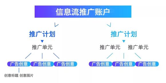 信息流賬戶結(jié)構(gòu)分三步:推廣計(jì)劃、推廣單元、廣告創(chuàng)意。